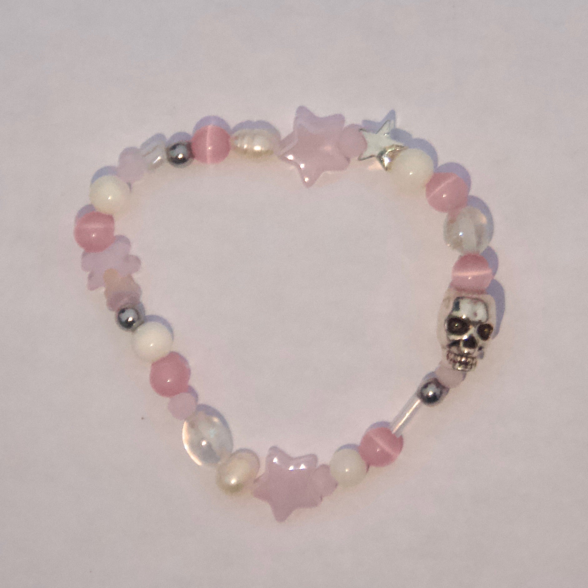 - This bracelet features pink cats eye, clear quartz and pearl beads.